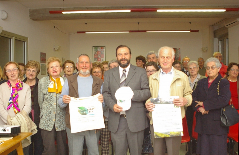 Foto ricordo con i partecipanti alla Conferenza del Prof. Marco Devecchi, Presidente dell Osservatorio del Paesaggio per il Monferrato e l Astigiano. In primo piano e a sx il Sig. Giancarlo Scarrone, in centro, il Prof. Marco Devecchi e a dx il sig Terzano.